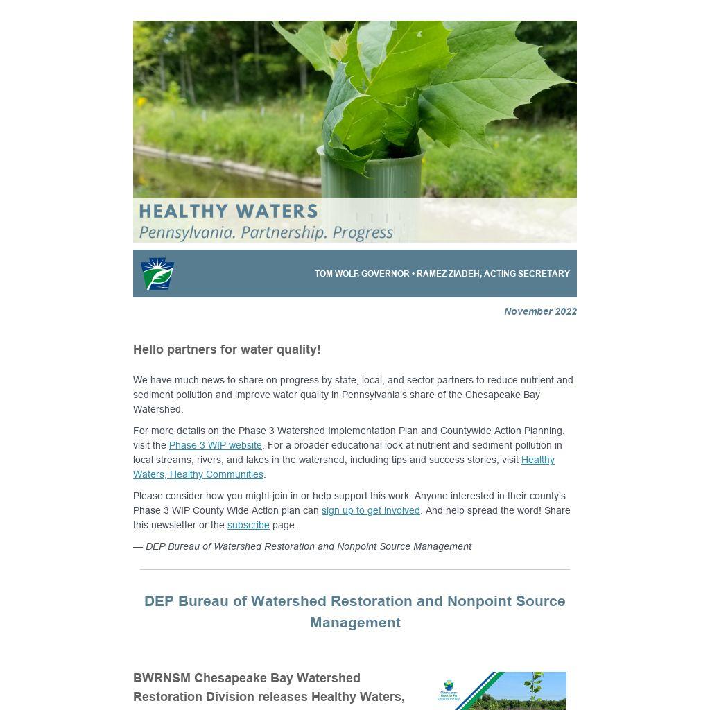 We have much news to share on progress by state, local, and sector partners to reduce nutrient and sediment pollution and improve water quality in Pennsylvania’s share of the Chesapeake Bay Watershed.