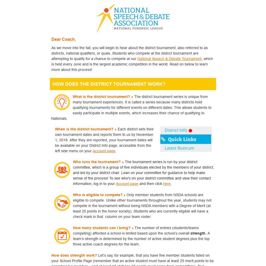 Partnered events always take precedence; i.e., you may not leave your partner behind. If students qualify in a partner event, that event must be taken to Nationals unless both students qualify in another event. If students are double entered in two partner events (e.g., Public Forum and Duo) students must have the same partner in both events. If one partner is not able to attend the National Tournament, other partners may not be substituted, and the remaining student cannot take the other event – the partnership event will be dropped entirely.