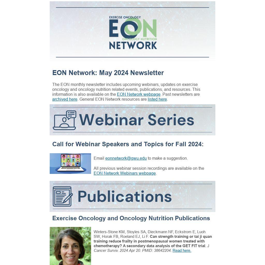 The EON monthly newsletter includes upcoming webinars, updates on exercise oncology and oncology nutrition related events, publications, and resources. This information is also available on the EON Network webpage. Past newsletters are archived here. General EON Network resources are listed here.