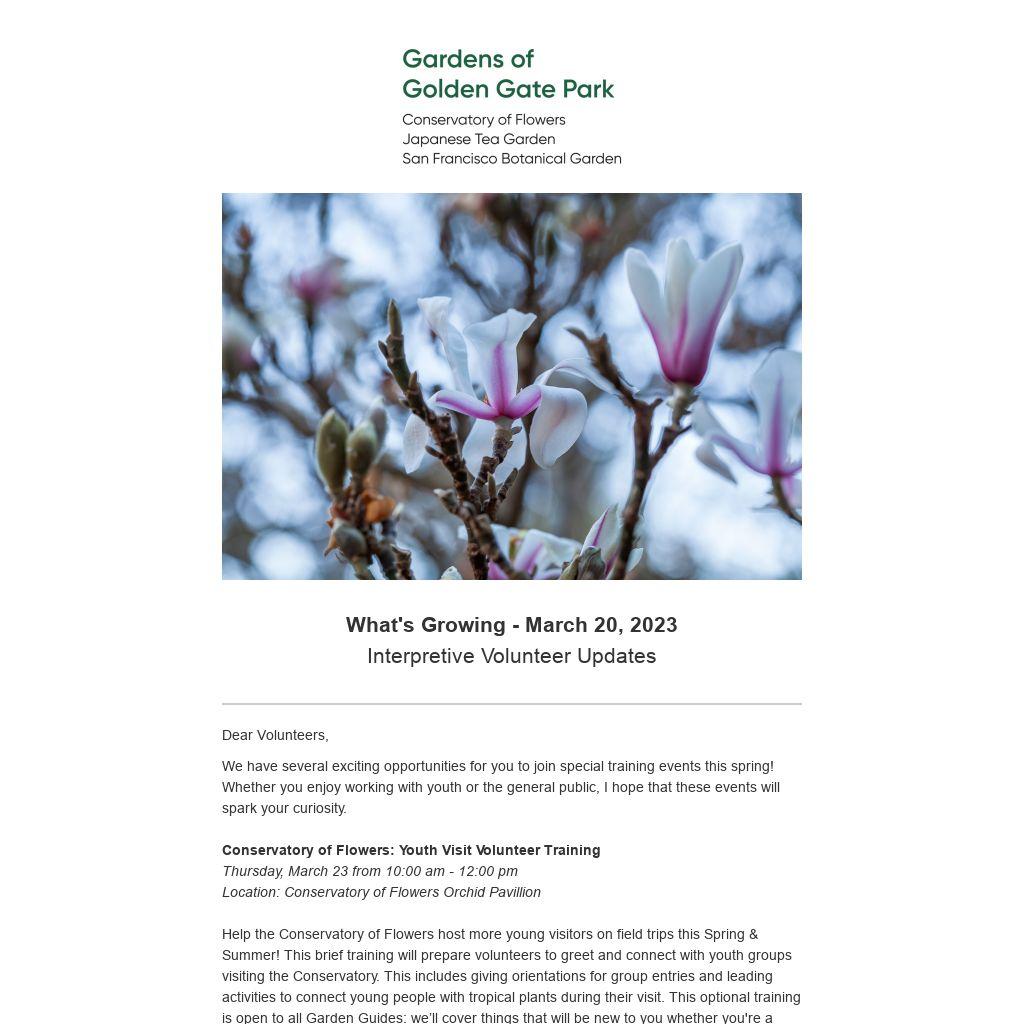 Join us as we gather volunteers & staff from all three gardens to share updates on how we are connecting volunteering opportunities within the Gardens of Golden Gate Park and answer your questions related to interpretive programs across the gardens. We hope you'll join us for this 3-meeting series if you lead tours, host interpretive stations, rove at the Conservatory of Flowers and Botanical Garden, or lead City Guide tours at the Japanese Tea Garden. We're excited to convene this wonderful community of volunteers together! RSVP Here.