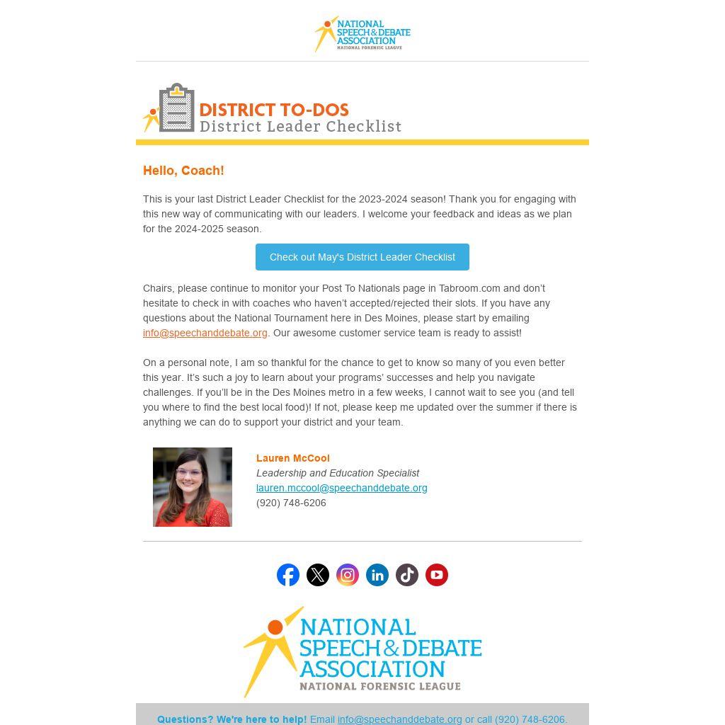 Chairs, please continue to monitor your Post To Nationals page in Tabroom.com and don’t hesitate to check in with coaches who haven’t accepted/rejected their slots. If you have any questions about the National Tournament here in Des Moines, please start by emailing info@speechanddebate.org. Our awesome customer service team is ready to assist!