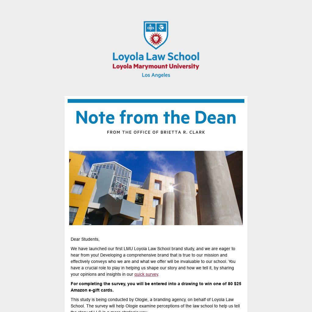 We have launched our first LMU Loyola Law School brand study, and we are eager to hear from you! Developing a comprehensive brand that is true to our mission and effectively conveys who we are and what we offer will be invaluable to our school. You have a crucial role to play in helping us shape our story and how we tell it, by sharing your opinions and insights in our quick survey.