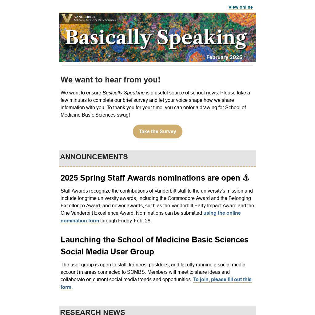 We want to ensure Basically Speaking is a useful source of school news. Please take a few minutes to complete our brief survey and let your voice shape how we share information with you. To thank you for your time, you can enter a drawing for School of Medicine Basic Sciences swag!
