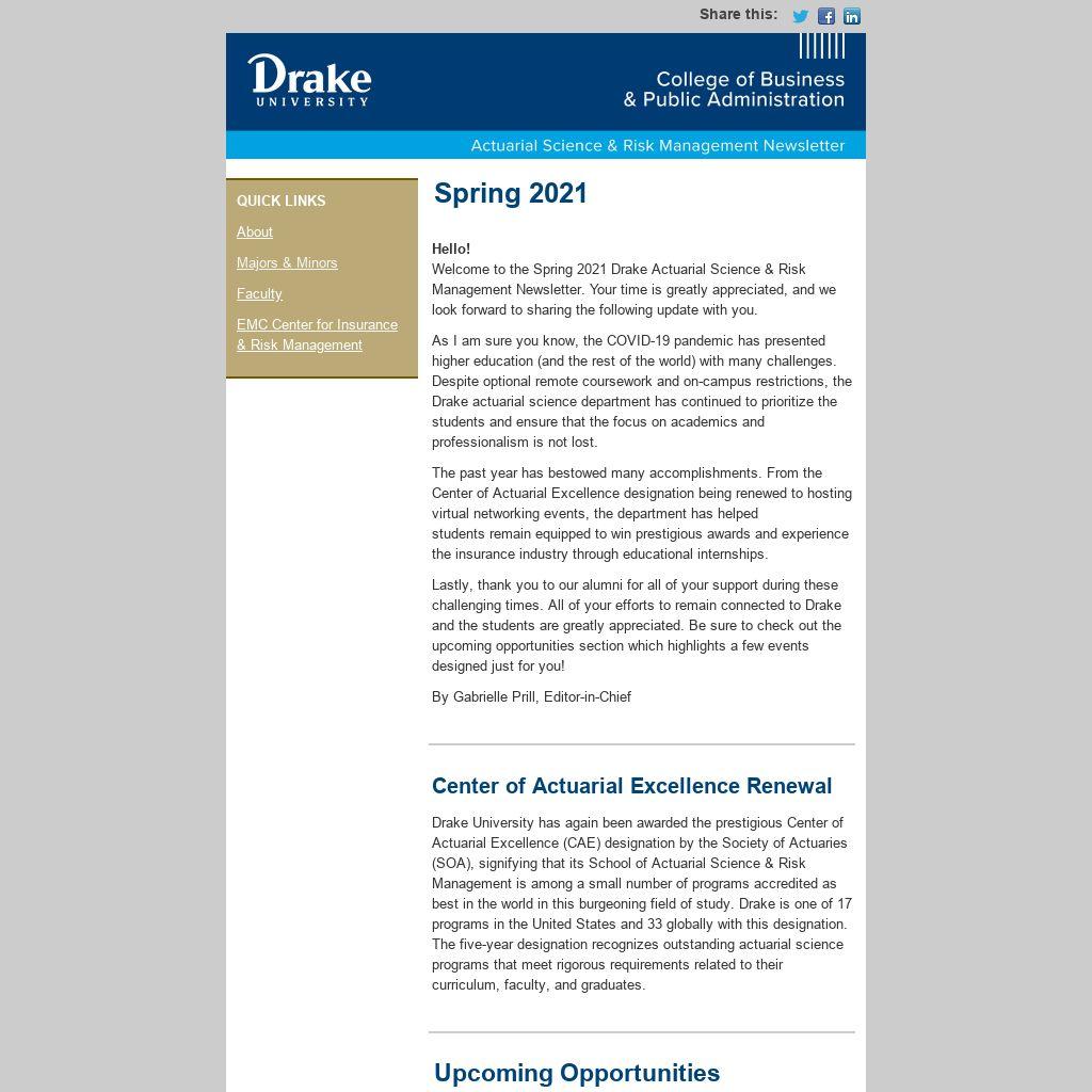 - Increase visibility for the risk management and insurance minor with employers. Learn what skills and knowledge base employers need their new hires to possess and build it into Drake’s curriculum.