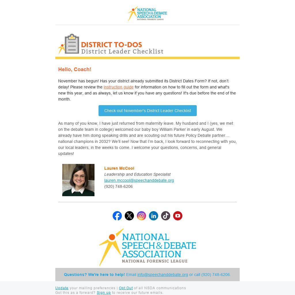 As many of you know, I have just returned from maternity leave. My husband and I (yes, we met on the debate team in college) welcomed our baby boy William Parker in early August. We already have him doing speaking drills and are scouting out his future Policy Debate partner… national champions in 2032? We’ll see! Now that I’m back, I look forward to reconnecting with you, our local leaders, in the weeks to come. I welcome your questions, concerns, and general updates!