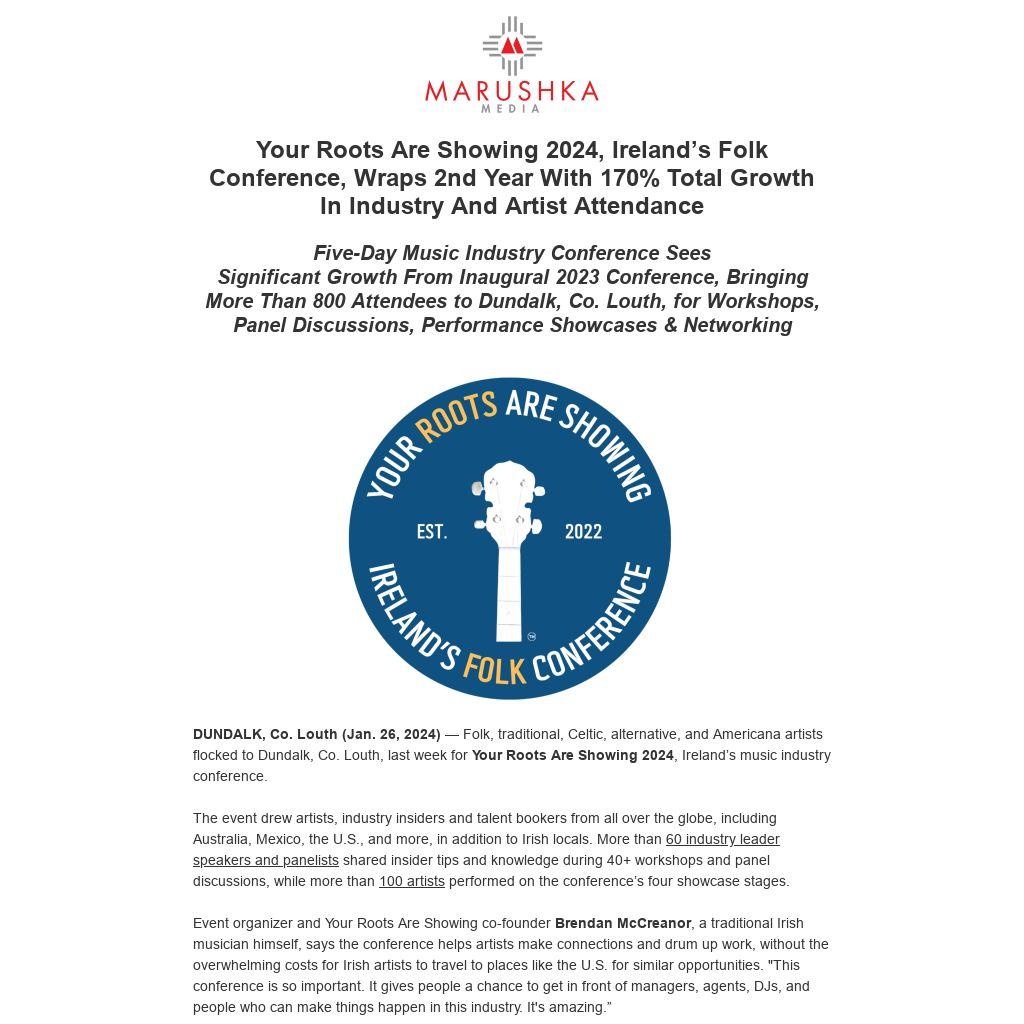 | DUNDALK, Co. Louth (Jan. 26, 2024) — Folk, traditional, Celtic, alternative, and Americana artists flocked to Dundalk, Co. Louth, last week for Your Roots Are Showing 2024, Ireland’s music industry conference.
