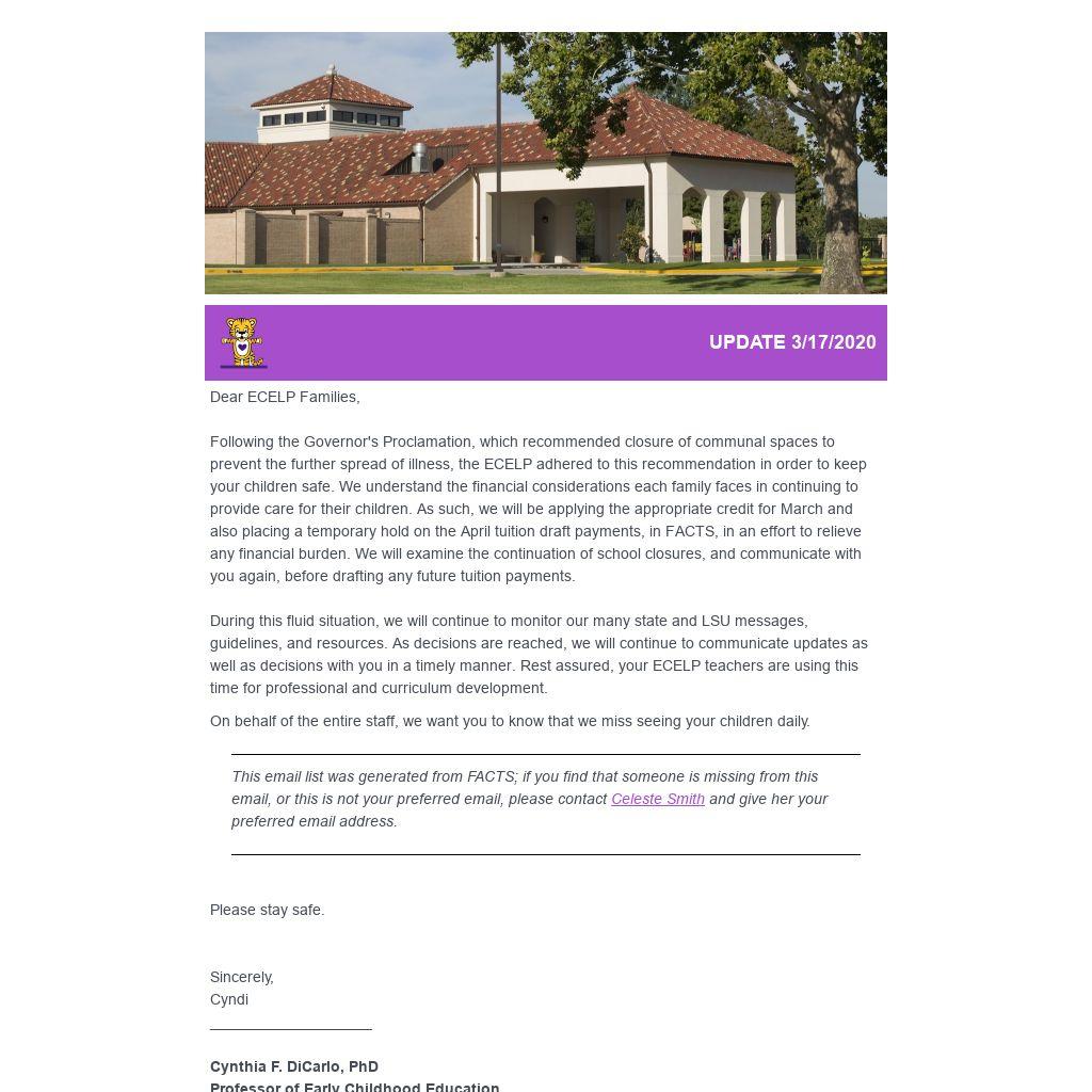 Following the Governor's Proclamation, which recommended closure of communal spaces to prevent the further spread of illness, the ECELP adhered to this recommendation in order to keep your children safe. We understand the financial considerations each family faces in continuing to provide care for their children. As such, we will be applying the appropriate credit for March and also placing a temporary hold on the April tuition draft payments, in FACTS, in an effort to relieve any financial burden. We will examine the continuation of school closures, and communicate with you again, before drafting any future tuition payments.