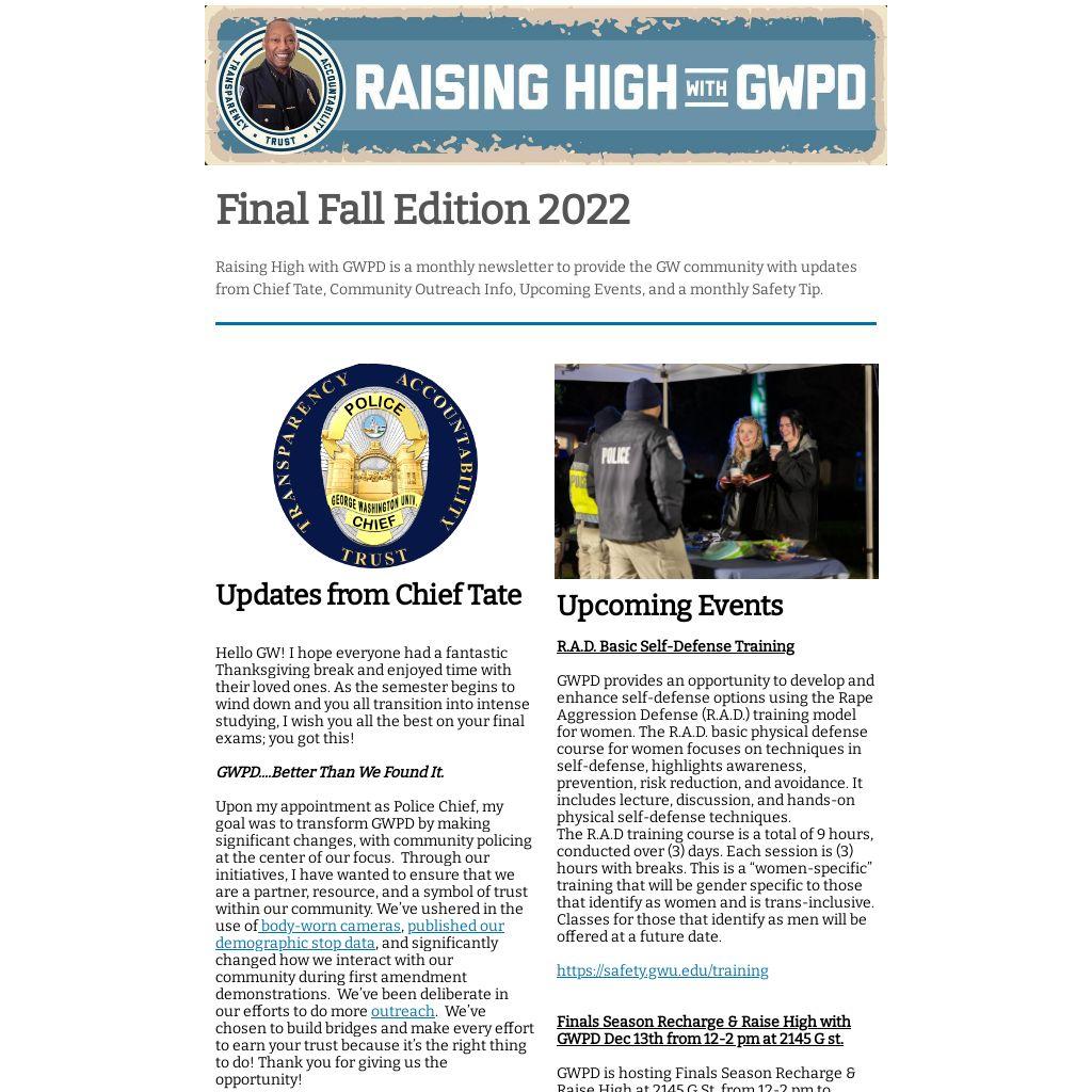 Raising High with GWPD is a monthly newsletter to provide the GW community with updates from Chief Tate, Community Outreach Info, Upcoming Events, and a monthly Safety Tip.