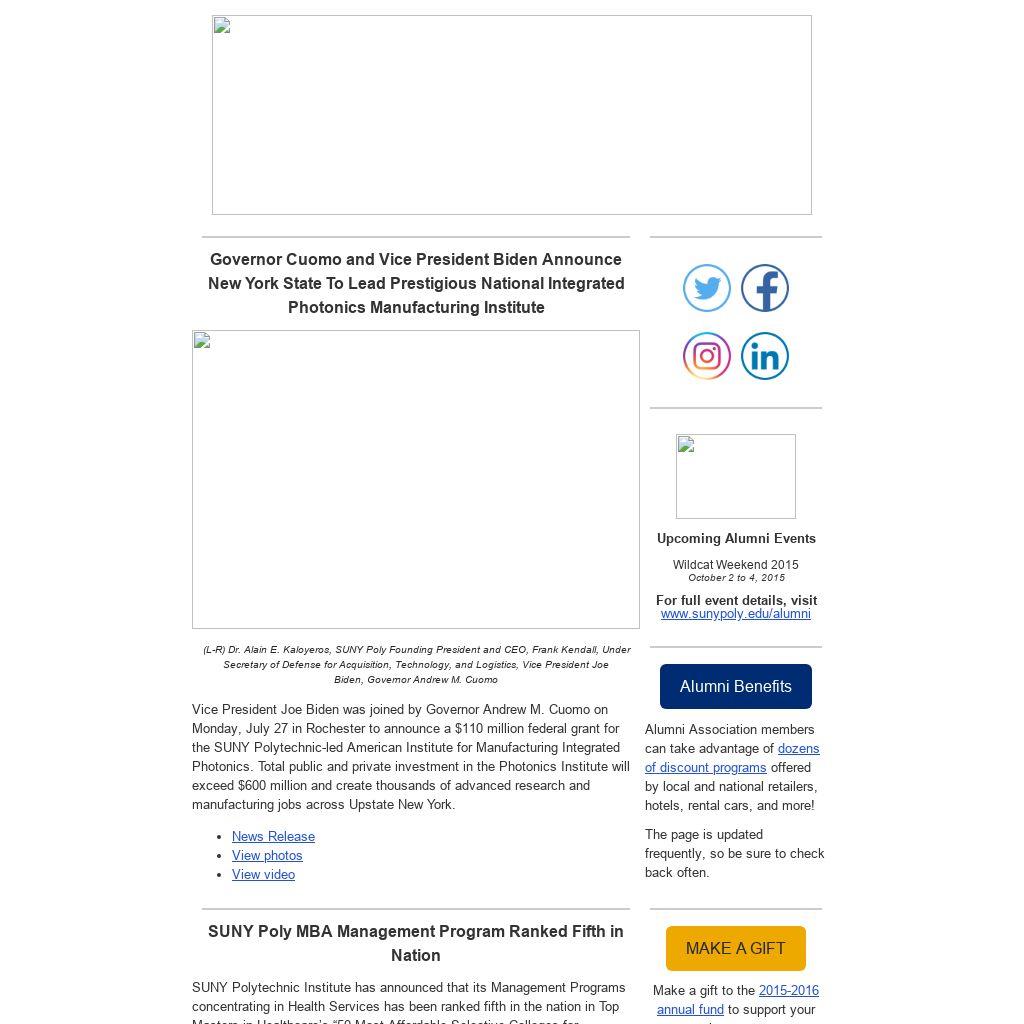 Vice President Joe Biden was joined by Governor Andrew M. Cuomo on Monday, July 27 in Rochester to announce a $110 million federal grant for the SUNY Polytechnic-led American Institute for Manufacturing Integrated Photonics. Total public and private investment in the Photonics Institute will exceed $600 million and create thousands of advanced research and manufacturing jobs across Upstate New York.