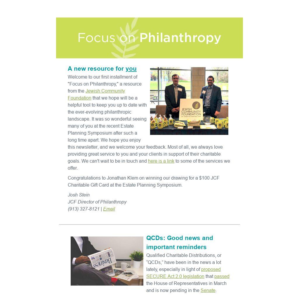 Welcome to our first installment of "Focus on Philanthropy," a resource from the Jewish Community Foundation that we hope will be a helpful tool to keep you up to date with the ever-evolving philanthropic landscape. It was so wonderful seeing many of you at the recent Estate Planning Symposium after such a long time apart. We hope you enjoy this newsletter, and we welcome your feedback. Most of all, we always love providing great service to you and your clients in support of their charitable goals. We can't wait to be in touch and here is a link to some of the services we offer.