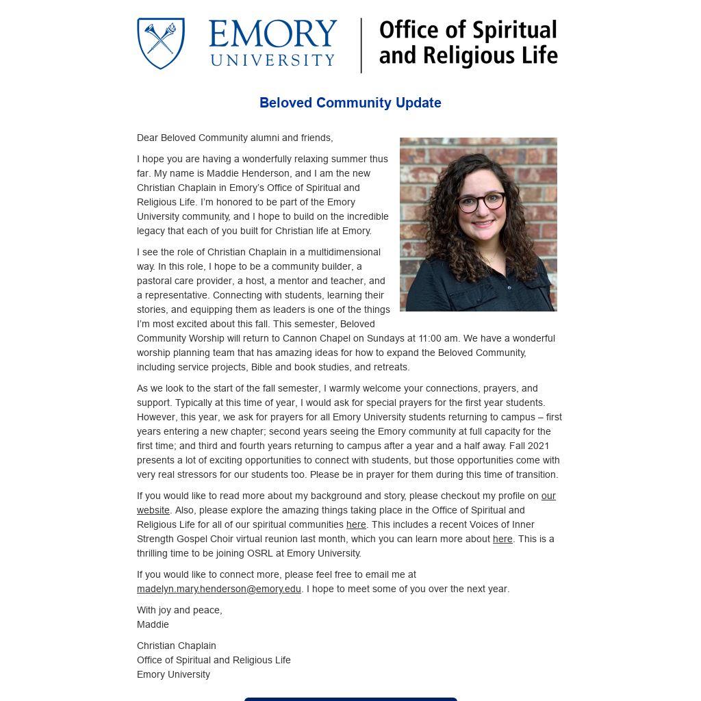 I hope you are having a wonderfully relaxing summer thus far. My name is Maddie Henderson, and I am the new Christian Chaplain in Emory’s Office of Spiritual and Religious Life. I’m honored to be part of the Emory University community, and I hope to build on the incredible legacy that each of you built for Christian life at Emory.