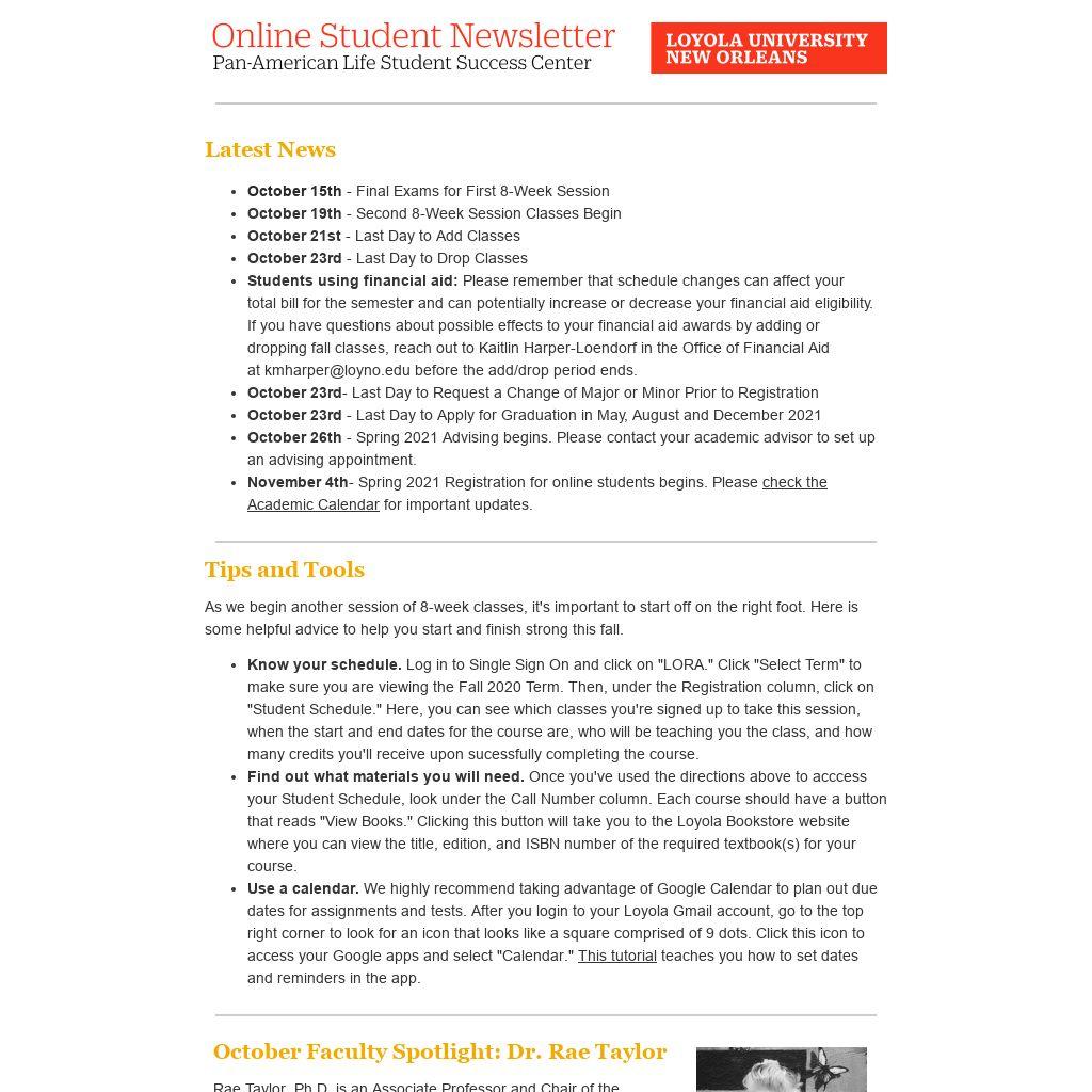 Each issue we will feature an online student or faculty/staff member who embodies the Ignatian ideals of faith, truth, justice, and service in our online community. If you'd like to nominate someone, please contact ssconlinega@loyno.edu to share who and why you think deserves to be in the spotlight.