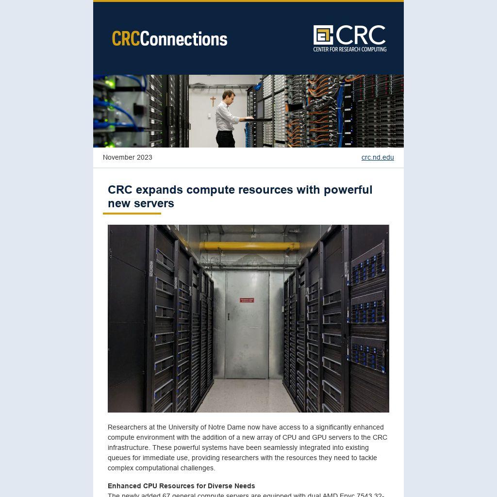 Researchers at the University of Notre Dame now have access to a significantly enhanced compute environment with the addition of a new array of CPU and GPU servers to the CRC infrastructure. These powerful systems have been seamlessly integrated into existing queues for immediate use, providing researchers with the resources they need to tackle complex computational challenges.