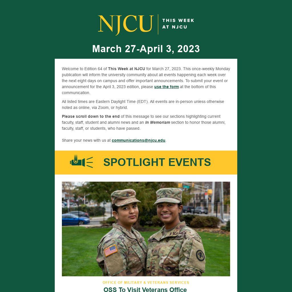 Welcome to Edition 64 of This Week at NJCU for March 27, 2023. This once-weekly Monday publication will inform the university community about all events happening each week over the next eight days on campus and offer important announcements. To submit your event or announcement for the April 3, 2023 edition, please use the form at the bottom of this communication.