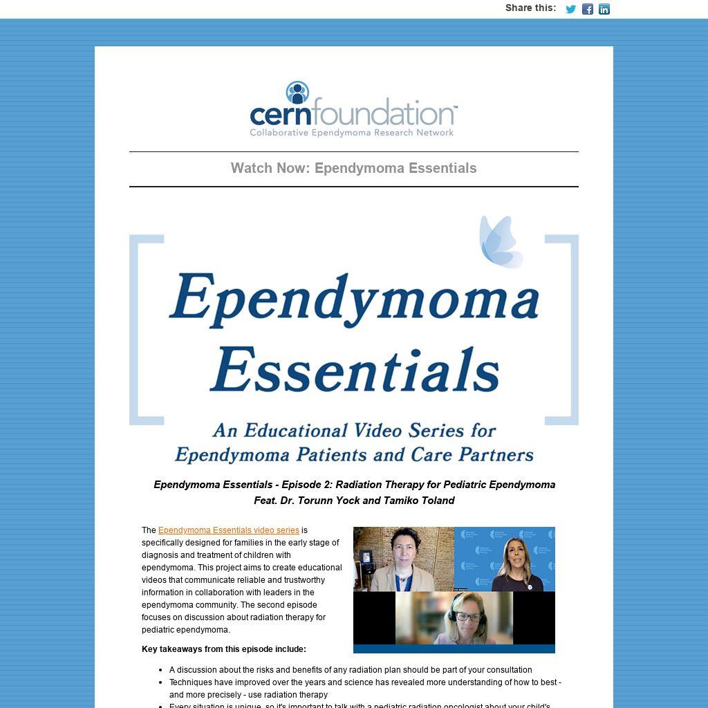 Ependymoma Essentials video series is specifically designed for families in the early stage of diagnosis and treatment of children with ependymoma. This project aims to create educational videos that communicate reliable and trustworthy information in collaboration with leaders in the ependymoma community. The second episode focuses on discussion about radiation therapy for pediatric ependymoma.