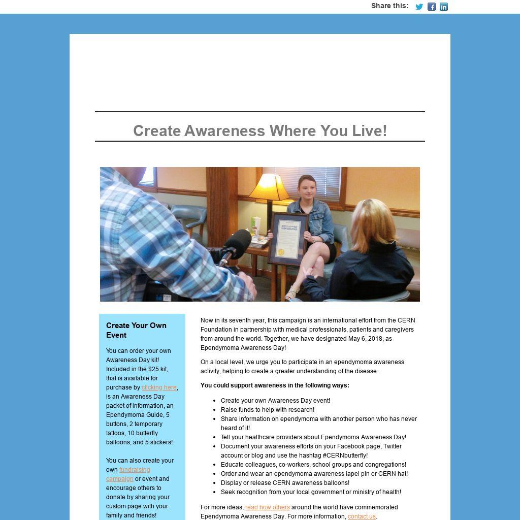 Now in its seventh year, this campaign is an international effort from the CERN Foundation in partnership with medical professionals, patients and caregivers from around the world. Together, we have designated May 6, 2018, as Ependymoma Awareness Day!