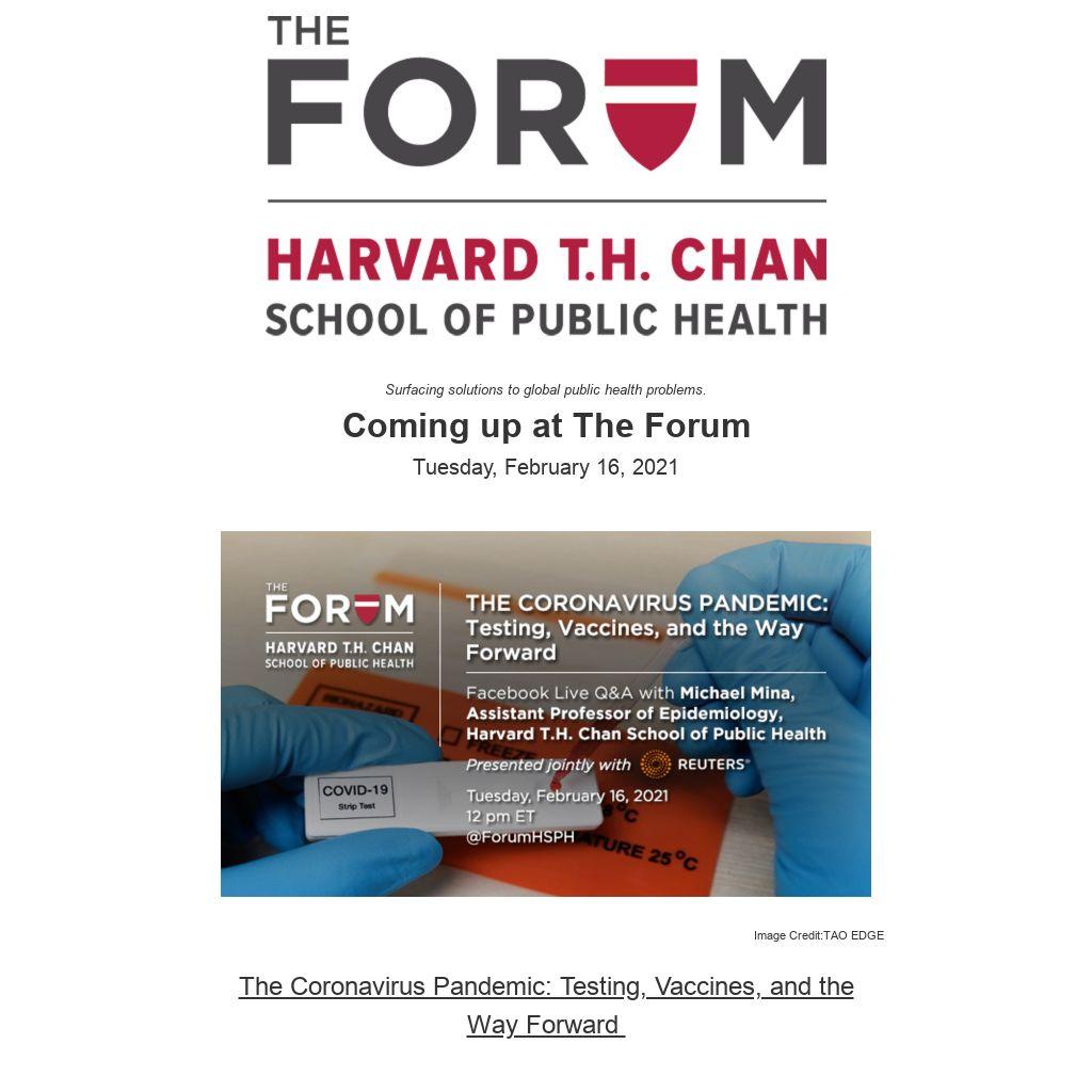 The COVID-19 vaccine rollout is now underway. But it will be some time before the vaccine is available to all who want it, and as people wait in line, the virus continues to spread and mutate, “pandemic fatigue” intensifies, and many schools and businesses remain shuttered. In this Forum Q&A, Harvard Chan epidemiologist Michael Mina talks with Reuters about the role of rapid testing at this critical moment in the progression of the pandemic. How do rapid tests work, and how could they be deployed at large scale to stop the spread of the virus, with or without widespread vaccination?