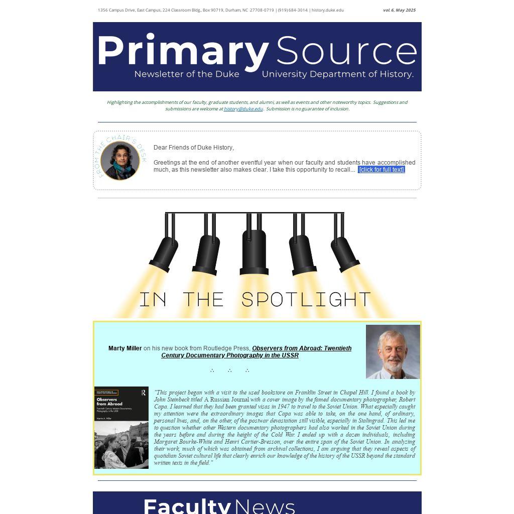 The next issue of Primary Source is scheduled for December 2025. Please submit all news items to history@duke.edu by 11/15/25.