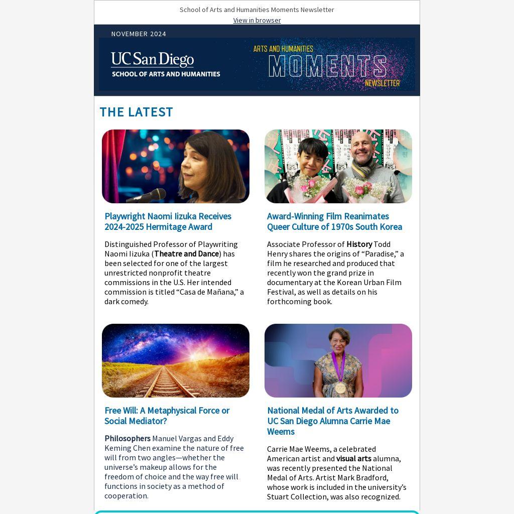 | Carrie Mae Weems, a celebrated American artist and visual arts alumna, was recently presented the National Medal of Arts. Artist Mark Bradford, whose work is included in the university’s Stuart Collection, was also recognized.