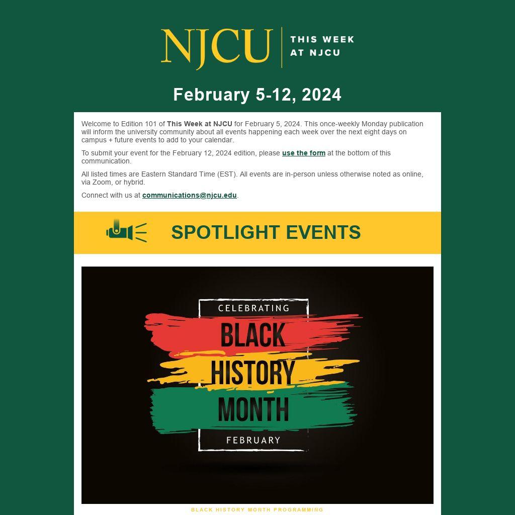 This Week at NJCU for February 5, 2024. This once-weekly Monday publication will inform the university community about all events happening each week over the next eight days on campus + future events to add to your calendar.