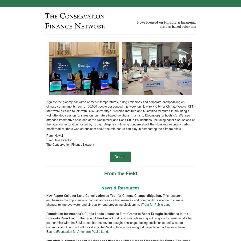 Against the gloomy backdrop of record temperatures, rising emissions and corporate backpedaling on climate commitments, some 100,000 people descended this week on New York City for Climate Week. CFN staff were pleased to join with Duke University's Nicholas Institute and Quantified Ventures in mounting a well-attended session for investors on nature-based solutions (thanks to Bloomberg for hosting). We also attended informative sessions at the Rockefeller and Doris Duke Foundations, including panel discussions at the latter on restoration hosted by 1t.org. Despite continuing concern about the slumping voluntary carbon credit market, there was enthusiasm about the role nature can play in combatting the climate crisis.