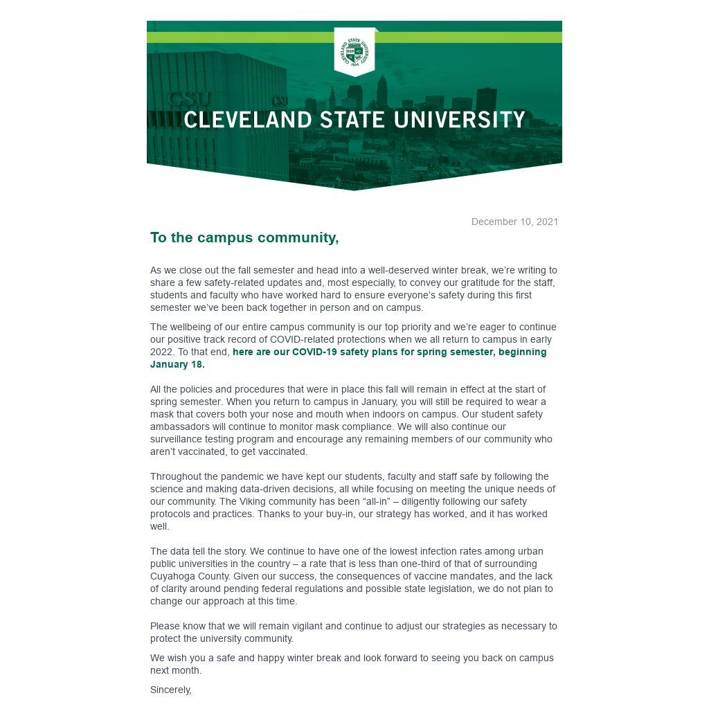 The data tell the story. We continue to have one of the lowest infection rates among urban public universities in the country – a rate that is less than one-third of that of surrounding Cuyahoga County. Given our success, the consequences of vaccine mandates, and the lack of clarity around pending federal regulations and possible state legislation, we do not plan to change our approach at this time.