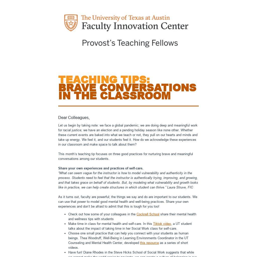 This month’s teaching tip focuses on three good practices for nurturing brave and meaningful conversations among our students.