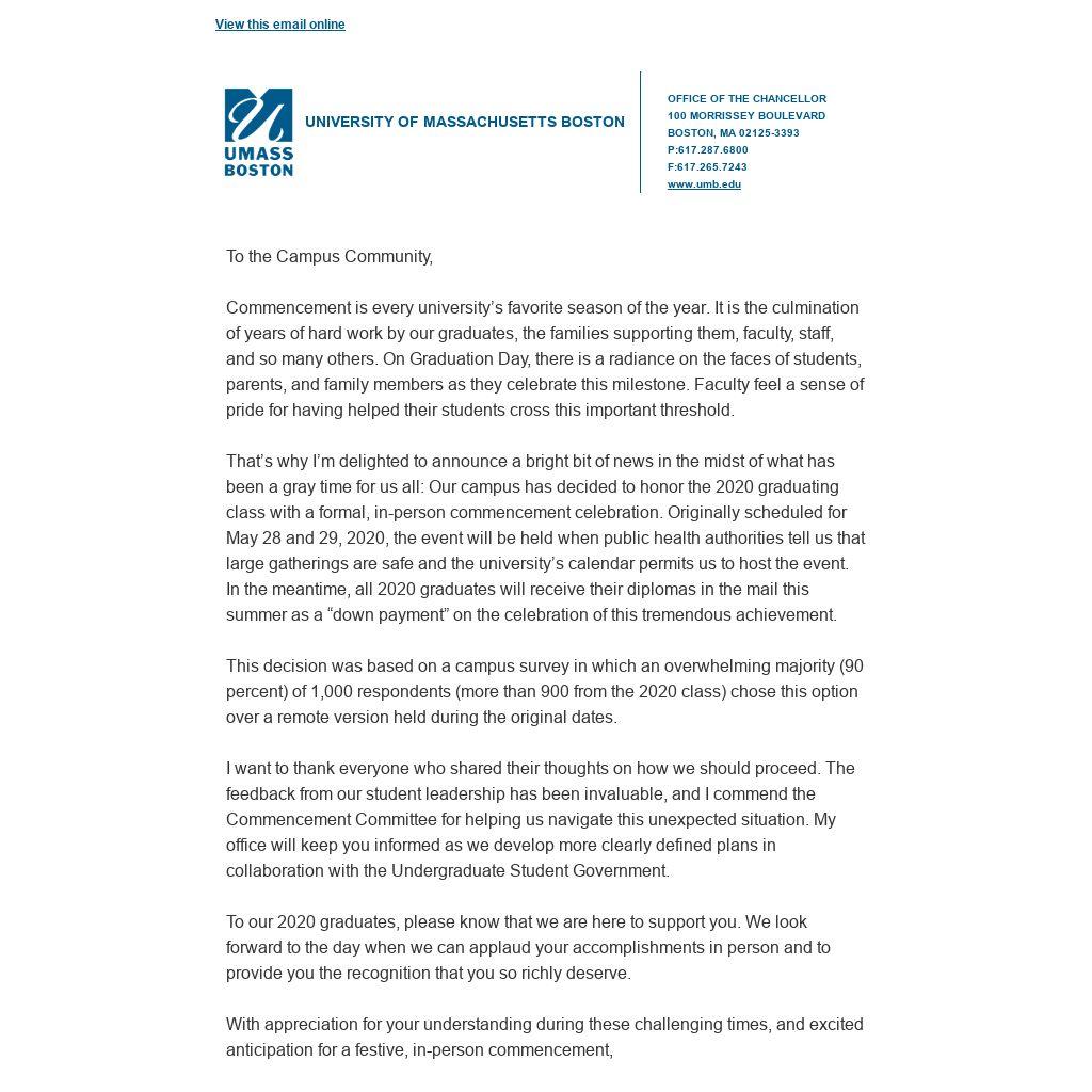 I want to thank everyone who shared their thoughts on how we should proceed. The feedback from our student leadership has been invaluable, and I commend the Commencement Committee for helping us navigate this unexpected situation. My office will keep you informed as we develop more clearly defined plans in collaboration with the Undergraduate Student Government.