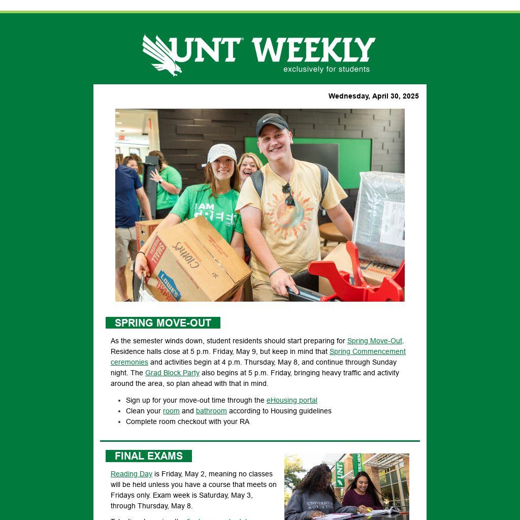 As the semester winds down, student residents should start preparing for Spring Move-Out. Residence halls close at 5 p.m. Friday, May 9, but keep in mind that Spring Commencement ceremonies and activities begin at 4 p.m. Thursday, May 8, and continue through Sunday night. The Grad Block Party also begins at 5 p.m. Friday, bringing heavy traffic and activity around the area, so plan ahead with that in mind.