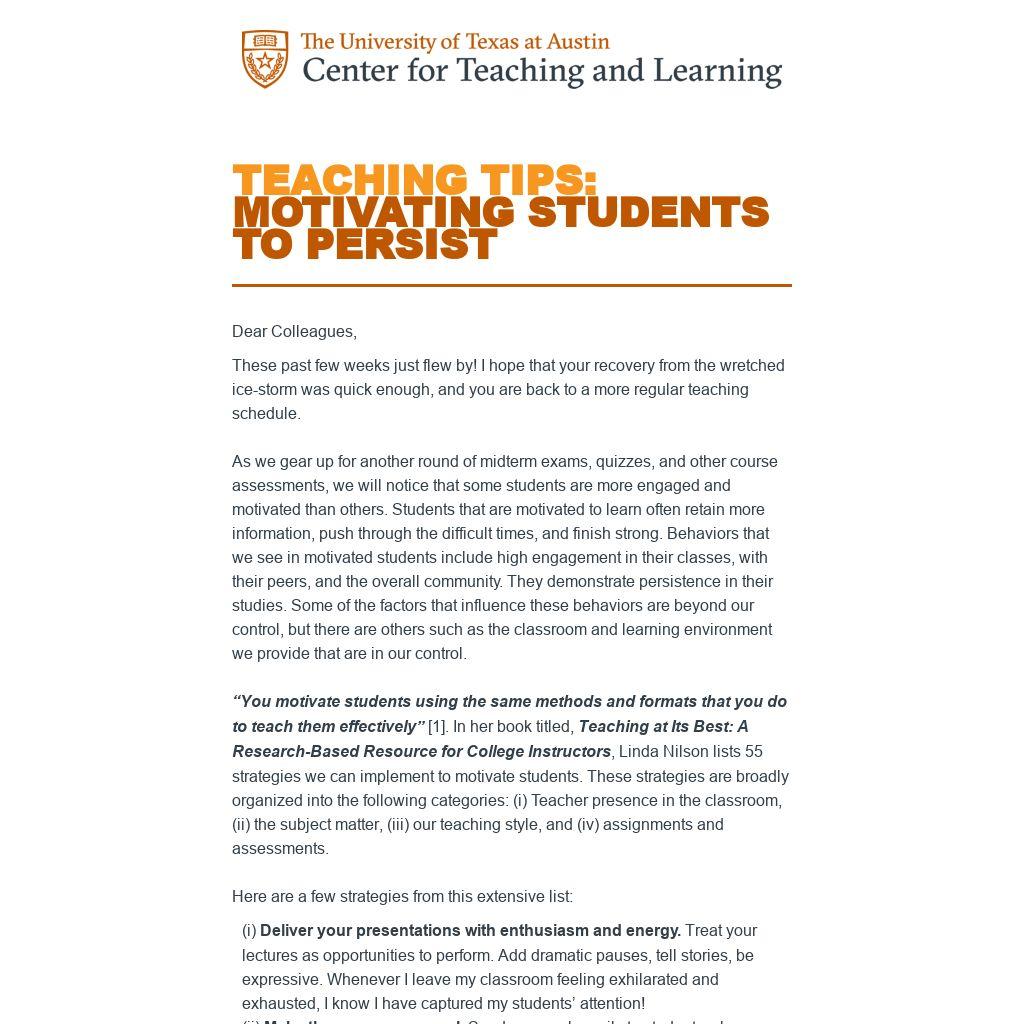 “You motivate students using the same methods and formats that you do to teach them effectively” [1]. In her book titled, Teaching at Its Best: A Research-Based Resource for College Instructors, Linda Nilson lists 55 strategies we can implement to motivate students. These strategies are broadly organized into the following categories: (i) Teacher presence in the classroom, (ii) the subject matter, (iii) our teaching style, and (iv) assignments and assessments.