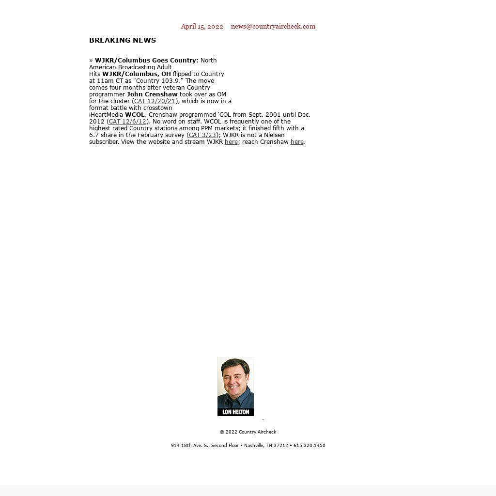 | -1.jpg) | April 15, 2022 news@countryaircheck.com | | |