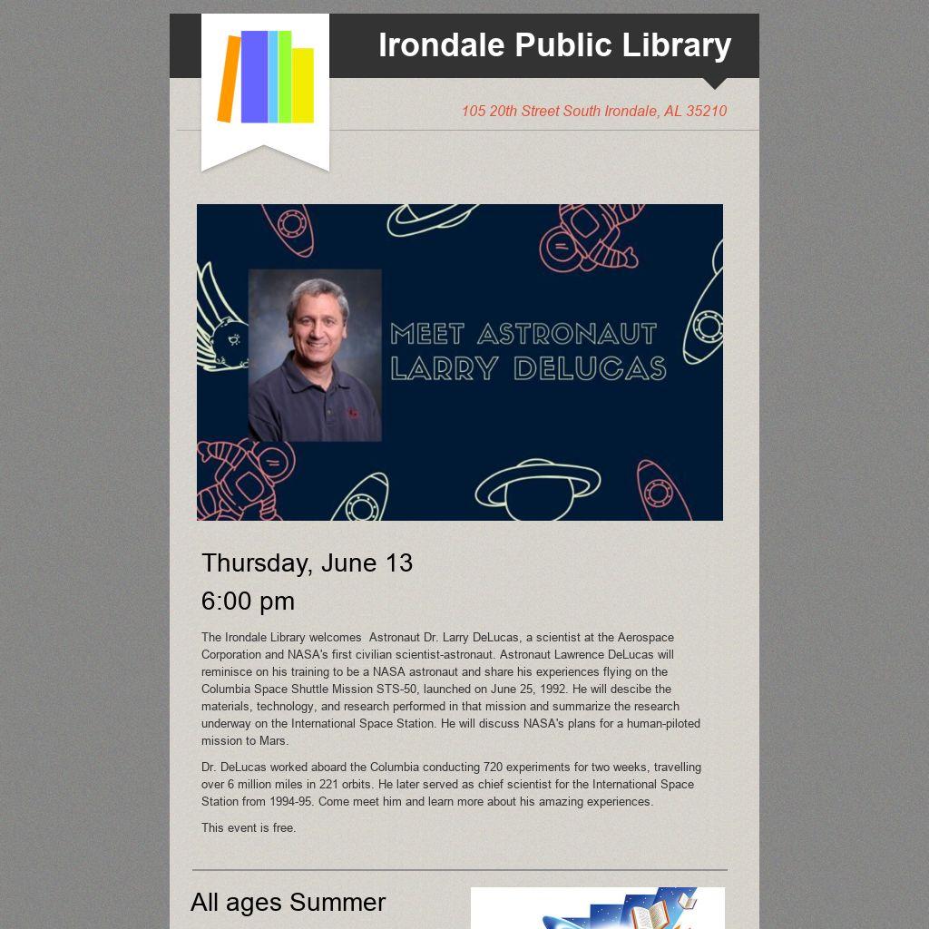 The Irondale Library welcomes Astronaut Dr. Larry DeLucas, a scientist at the Aerospace Corporation and NASA's first civilian scientist-astronaut. Astronaut Lawrence DeLucas will reminisce on his training to be a NASA astronaut and share his experiences flying on the Columbia Space Shuttle Mission STS-50, launched on June 25, 1992. He will descibe the materials, technology, and research performed in that mission and summarize the research underway on the International Space Station. He will discuss NASA's plans for a human-piloted mission to Mars.