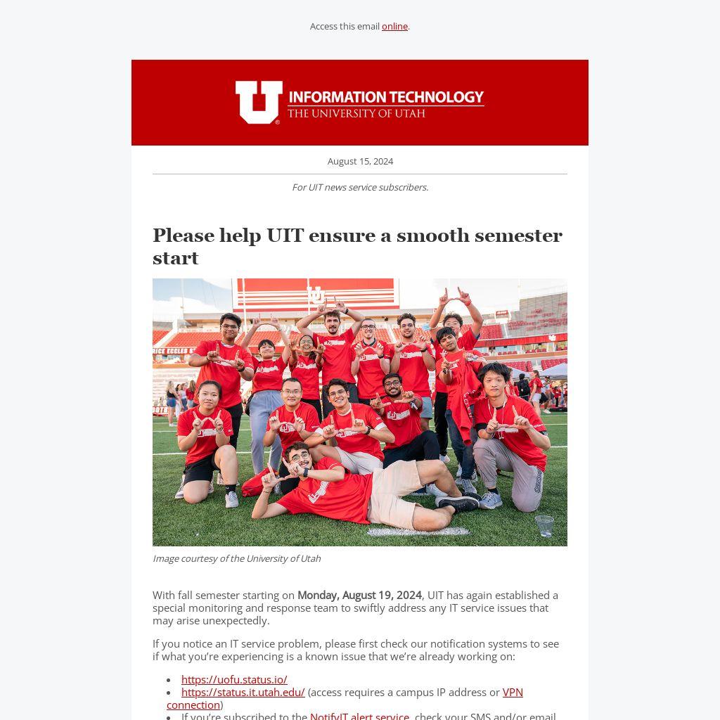 With fall semester starting on Monday, August 19, 2024, UIT has again established a special monitoring and response team to swiftly address any IT service issues that may arise unexpectedly.