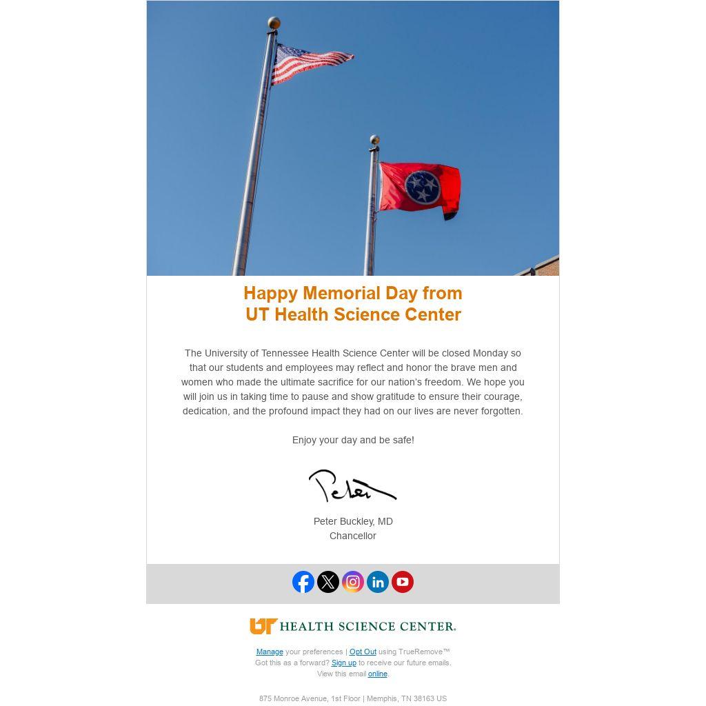 The University of Tennessee Health Science Center will be closed Monday so that our students and employees may reflect and honor the brave men and women who made the ultimate sacrifice for our nation’s freedom. We hope you will join us in taking time to pause and show gratitude to ensure their courage, dedication, and the profound impact they had on our lives are never forgotten.