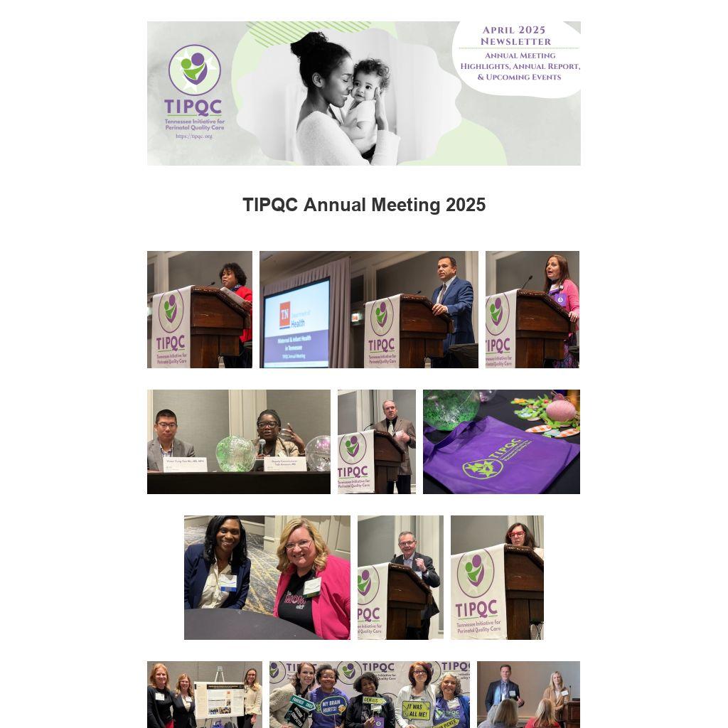 With over 500 attendees, the TIPQC Annual Meeting kicked off with a celebration of all the hard work over the past year - not to mention the last 17 years! Highlights always include Commissioner Dr. Alvarado, Simulation Training, Project, QI, AI, and Lactation Workforce Training Workshops, the Poster Session, The Mother's Milk Bank reception, and the Fire Side Chat with Deputy Commissioner Tobi Amosun, MD and Victor Wu, MD, MPH. Speaker highlights this year included Josef Neu, MD from the University of Florida, Diana Wolfe, MD, MPH from Albert Einstein College of Medicine, Kristina Dulaney, RN, MPH from Cherished Moms, James Barry, MD, MBA University of Colorado Health, Eva Dye, DNP from Monroe Carell Jr. Children's Hospital at Vanderbilt, Jay Naliboff, MD from the Maine PQC, Trisha Short, BSN, RNC-OB from TeamBirth, Solaire Spellen, MPH from IRTH, and Tiffany Taft, PhD from Count the Kicks. A myriad of speakers also presented at all of the workshops. TIPQC greatly appreciates the expertise and time these presenters, the volunteers, Blue Care TN, Wellpoint, United Healthcare Community Plan, and the Tennessee Department of Health for their generous support, and so many others who contributed to making this a success.