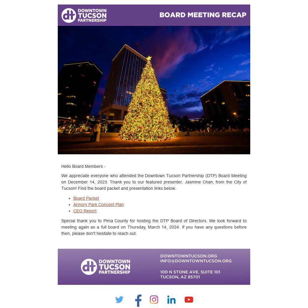 We appreciate everyone who attended the Downtown Tucson Partnership (DTP) Board Meeting on December 14, 2023. Thank you to our featured presenter, Jasmine Chan, from the City of Tucson! Find the board packet and presentation links below.