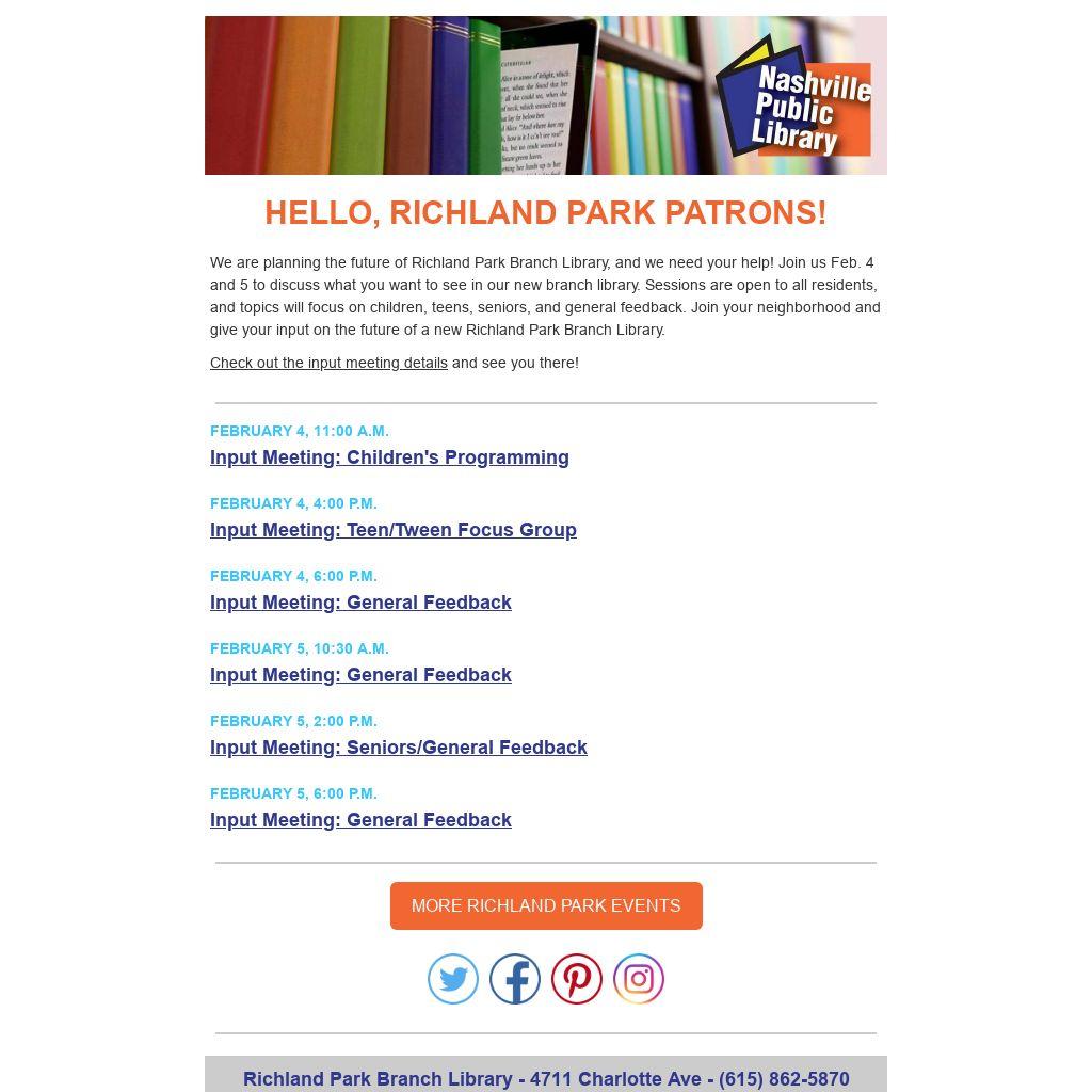 We are planning the future of Richland Park Branch Library, and we need your help! Join us Feb. 4 and 5 to discuss what you want to see in our new branch library. Sessions are open to all residents, and topics will focus on children, teens, seniors, and general feedback. Join your neighborhood and give your input on the future of a new Richland Park Branch Library.