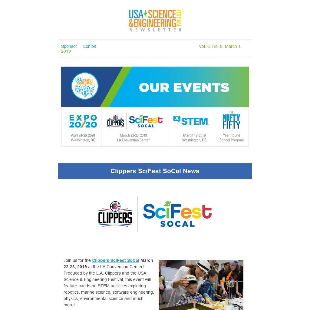Join us for the Clippers SciFest SoCal March 22-23, 2019 at the LA Convention Center! Produced by the L.A. Clippers and the USA Science & Engineering Festival, this event will feature hands-on STEM activities exploring robotics, marine science, software engineering, physics, environmental science and much more!