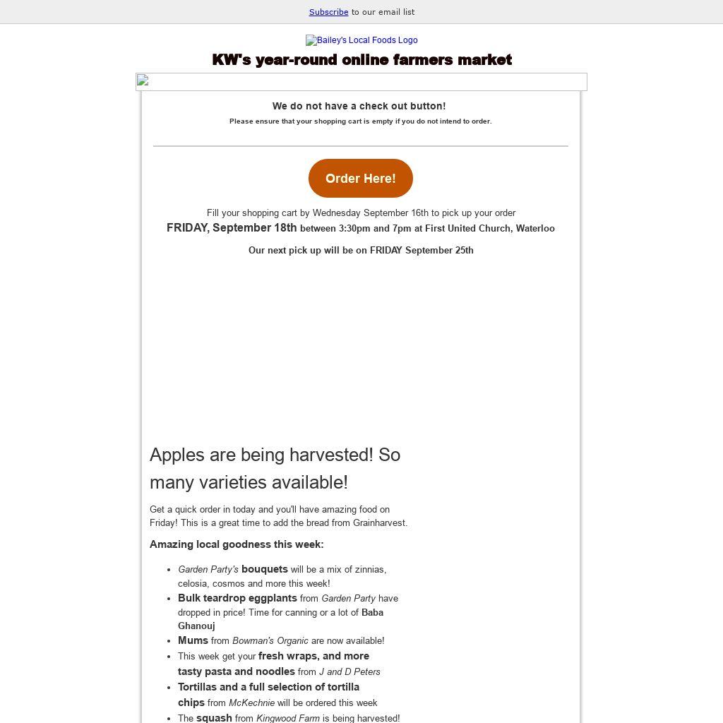 Fill your shopping cart by Wednesday September 16th to pick up your order FRIDAY, September 18th between 3:30pm and 7pm at First United Church, Waterloo