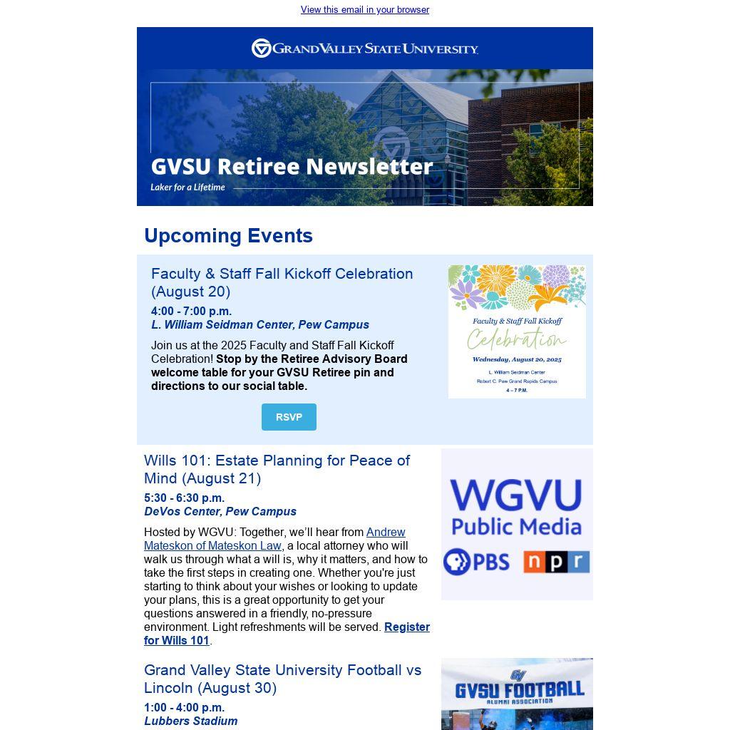 Join us at the 2025 Faculty and Staff Fall Kickoff Celebration! Stop by the Retiree Advisory Board welcome table for your GVSU Retiree pin and directions to our social table.