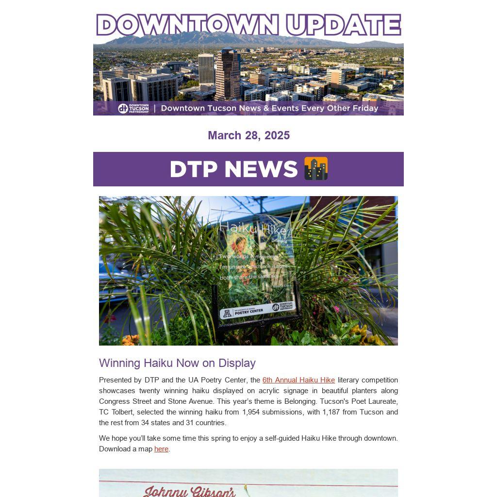 🌆 Downtown Tucson Partnership and the UA Poetry Center hosted a guided Haiku Hike on Saturday with over 20 attendees, including a few winners. One winner traveled as far as Chandler and shared their poem aloud.