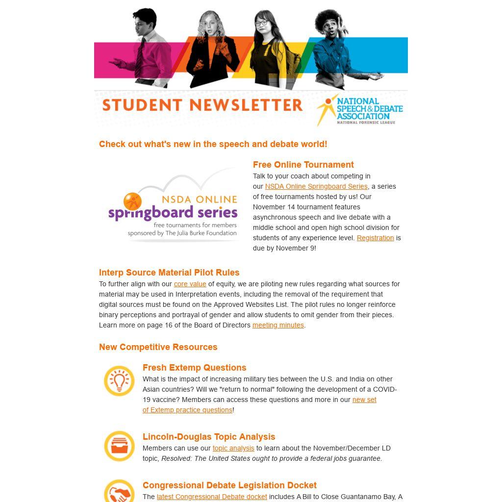 Talk to your coach about competing in our NSDA Online Springboard Series, a series of free tournaments hosted by us! Our November 14 tournament features asynchronous speech and live debate with a middle school and open high school division for students of any experience level. Registration is due by November 9!