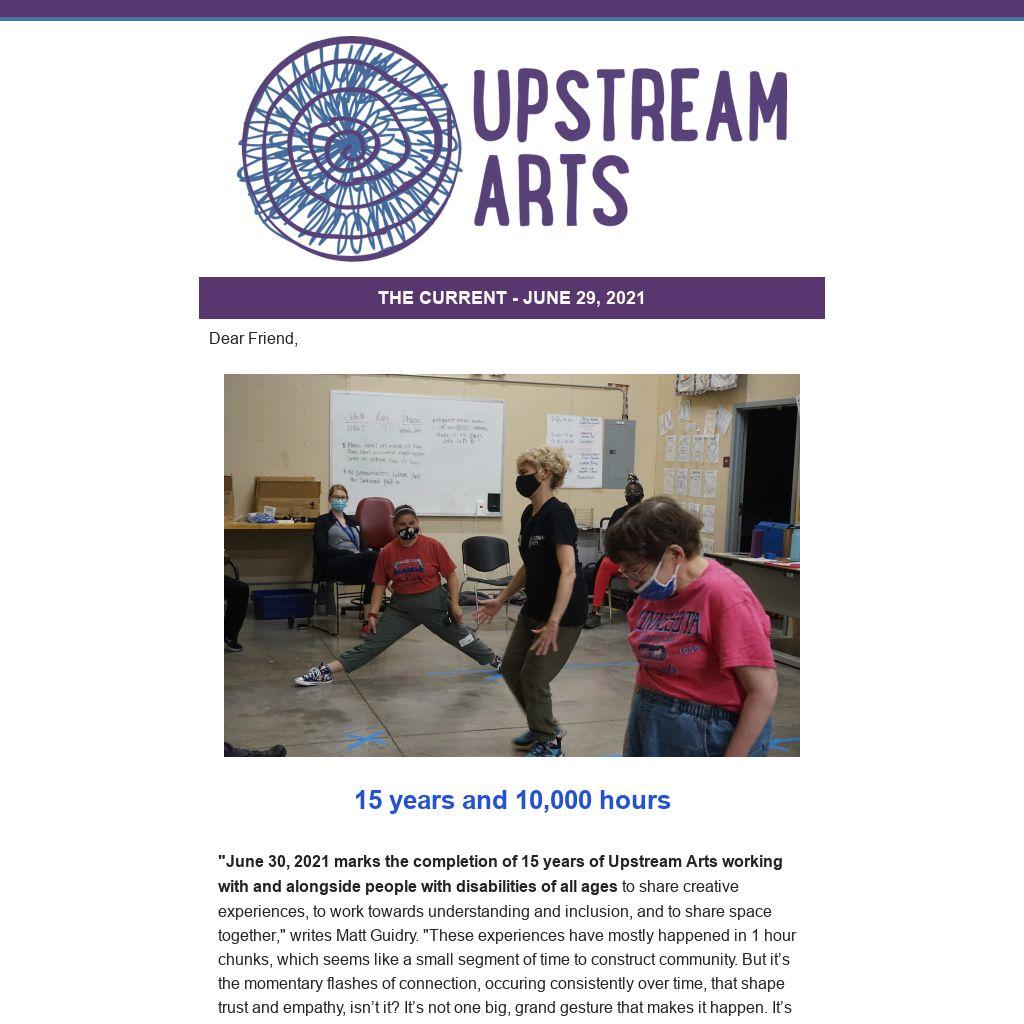 "June 30, 2021 marks the completion of 15 years of Upstream Arts working with and alongside people with disabilities of all ages to share creative experiences, to work towards understanding and inclusion, and to share space together," writes Matt Guidry. "These experiences have mostly happened in 1 hour chunks, which seems like a small segment of time to construct community. But it’s the momentary flashes of connection, occuring consistently over time, that shape trust and empathy, isn’t it? It’s not one big, grand gesture that makes it happen. It’s the small moments that are the building blocks."