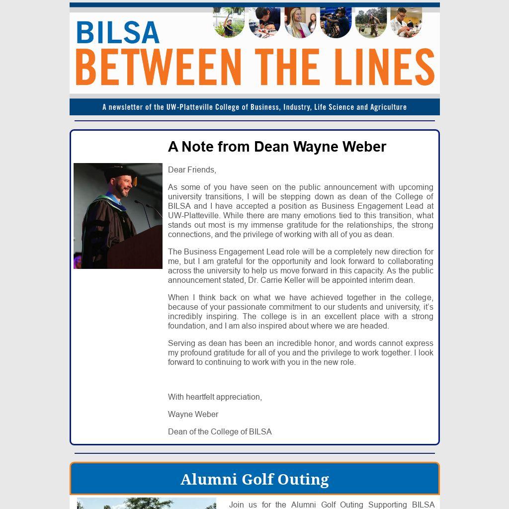 As some of you have seen on the public announcement with upcoming university transitions, I will be stepping down as dean of the College of BILSA and I have accepted a position as Business Engagement Lead at UW-Platteville. While there are many emotions tied to this transition, what stands out most is my immense gratitude for the relationships, the strong connections, and the privilege of working with all of you as dean.