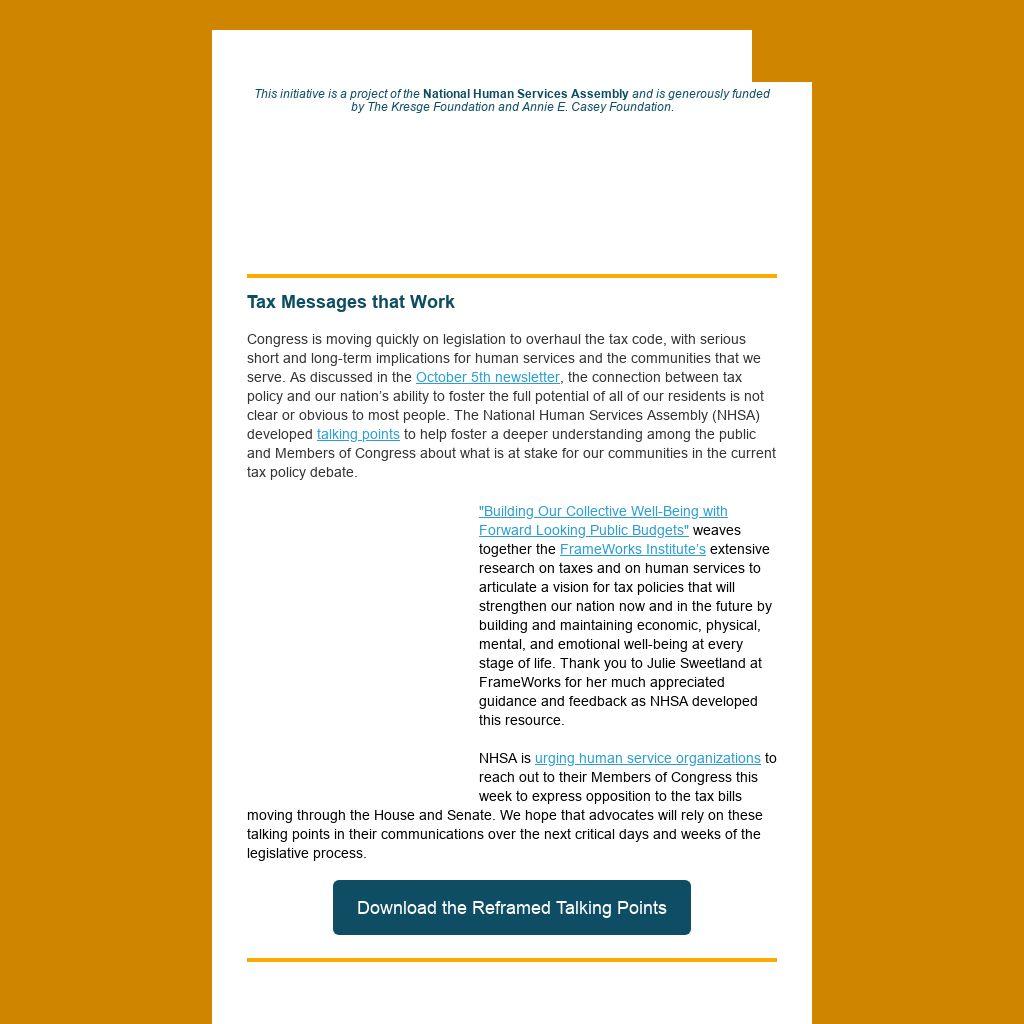 Congress is moving quickly on legislation to overhaul the tax code, with serious short and long-term implications for human services and the communities that we serve. As discussed in the October 5th newsletter, the connection between tax policy and our nation’s ability to foster the full potential of all of our residents is not clear or obvious to most people. The National Human Services Assembly (NHSA) developed talking points to help foster a deeper understanding among the public and Members of Congress about what is at stake for our communities in the current tax policy debate.