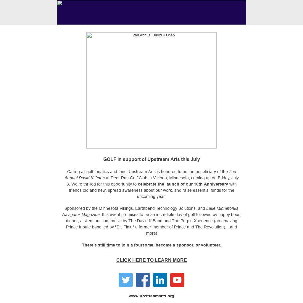 Calling all golf fanatics and fans! Upstream Arts is honored to be the beneficiary of the 2nd Annual David K Open at Deer Run Golf Club in Victoria, Minnesota, coming up on Friday, July 3. We’re thrilled for this opportunity to celebrate the launch of our 10th Anniversary with friends old and new, spread awareness about our work, and raise essential funds for the upcoming year.