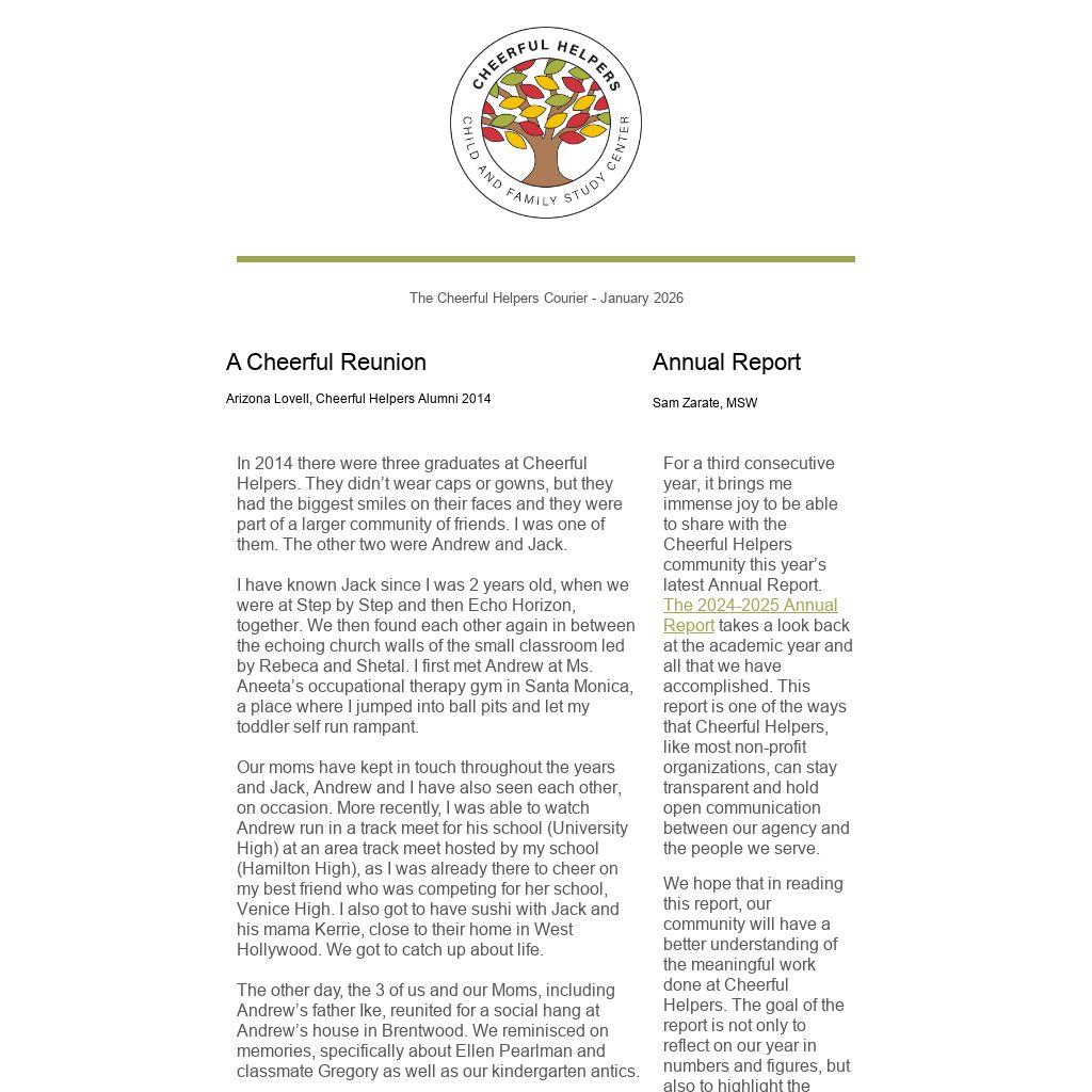 For a third consecutive year, it brings me immense joy to be able to share with the Cheerful Helpers community this year’s latest Annual Report. The 2024-2025 Annual Report takes a look back at the academic year and all that we have accomplished. This report is one of the ways that Cheerful Helpers, like most non-profit organizations, can stay transparent and hold open communication between our agency and the people we serve.