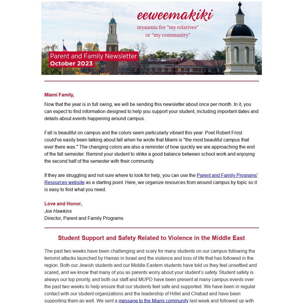 The past two weeks have been challenging and scary for many students on our campus following the terrorist attacks launched by Hamas in Israel and the violence and loss of life that has followed in the region. Both our Jewish students and our Middle Eastern students have told us they feel unsettled and scared, and we know that many of you as parents worry about your student’s safety. Student safety is always our top priority, and both our staff and MUPD have been present at many campus events over the past two weeks to help ensure that our students feel safe and supported. We have been in regular contact with our student organizations and the leadership of Hillel and Chabad and have been supporting them as well. We sent a message to the Miami community last week and followed up with an additional message in our weekly email to students on October 12. Students have been vocal and engaged on campus, while still demonstrating the Code of Love and Honor by being respectful of each other, even when they have differing views and perspectives. As this situation continues to develop, our police will continue to connect with state and federal agencies to scan for potential threats to our community, and our staff will continue to be present and support our students however we can.