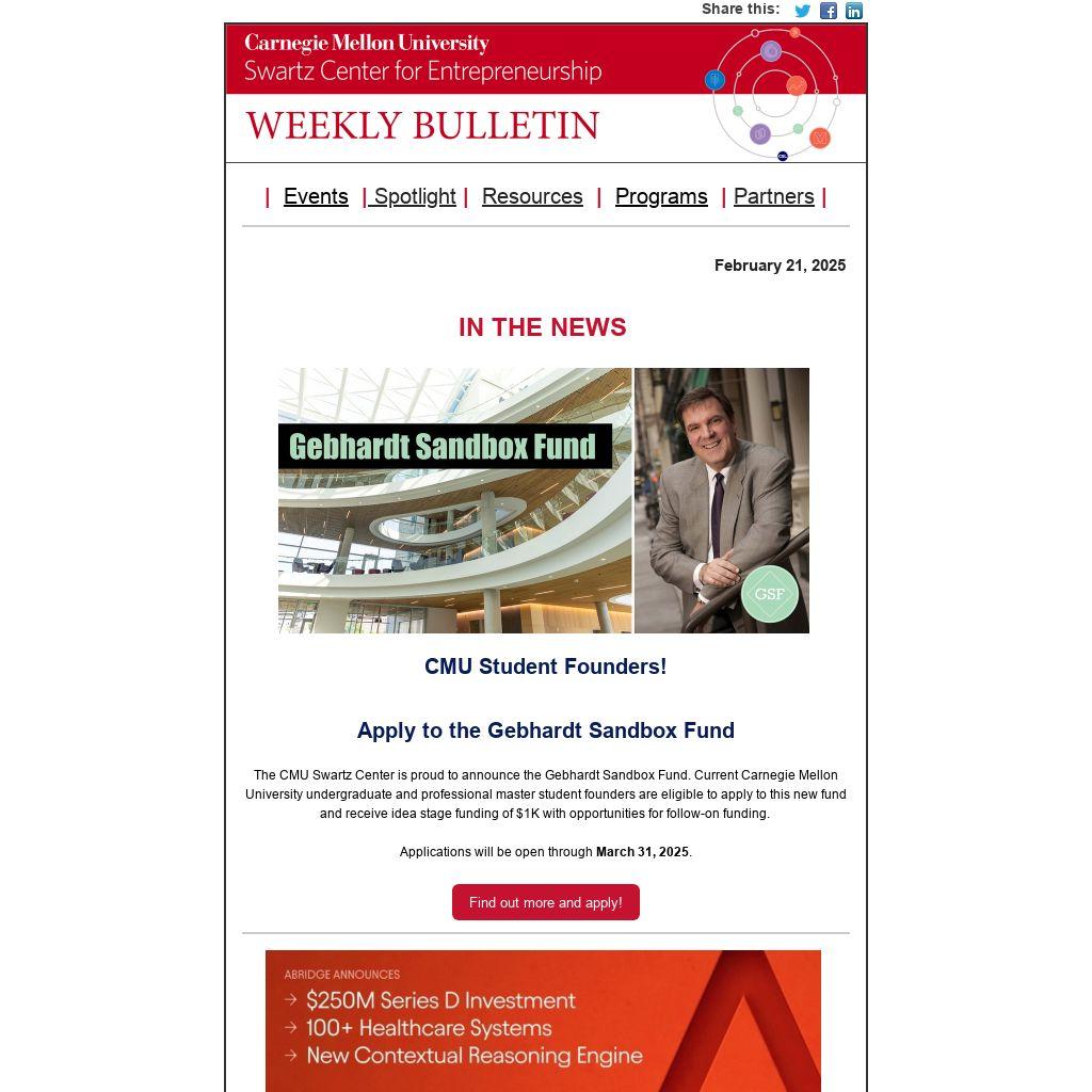 Have startup news or opportunities to share? Have questions about the Swartz Center Weekly Bulletin? Send news, opportunities or questions to Sonya Ford, Program Manager.