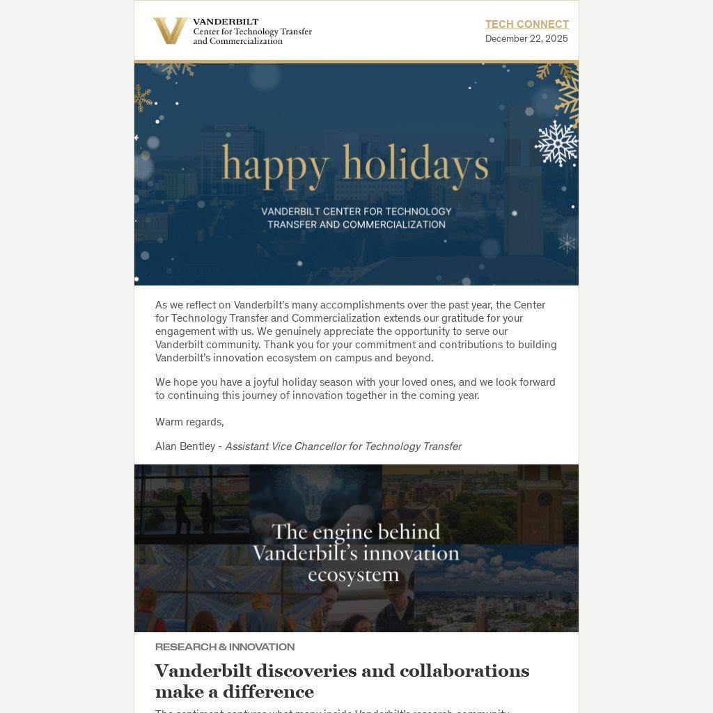 As we reflect on Vanderbilt’s many accomplishments over the past year, the Center for Technology Transfer and Commercialization extends our gratitude for your engagement with us. We genuinely appreciate the opportunity to serve our Vanderbilt community. Thank you for your commitment and contributions to building Vanderbilt’s innovation ecosystem on campus and beyond.